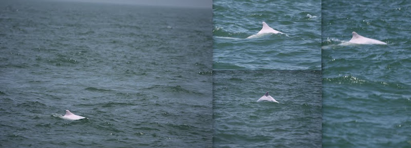 Dolphin-spotting is not easy. Unless you come with a good pair of binoculars or a super zoom lens, you are not going to get anywhere close to these magnificent mammals. (Unless you hired your own private boat to stalk them illegally.) Due to their unusual colour (pink), it was very difficult to spot them from a distant. You may mistake the "white caps" (waves) as their fins. Each appearance, these dolphins stayed about 2-3 seconds above water – it was very challenging to snap them. Elkan was grumbling all the time as he had little patience to spot them. He was more interested running up and down between the decks. (Eventually, he vomited and caused a big stinky mess.)
